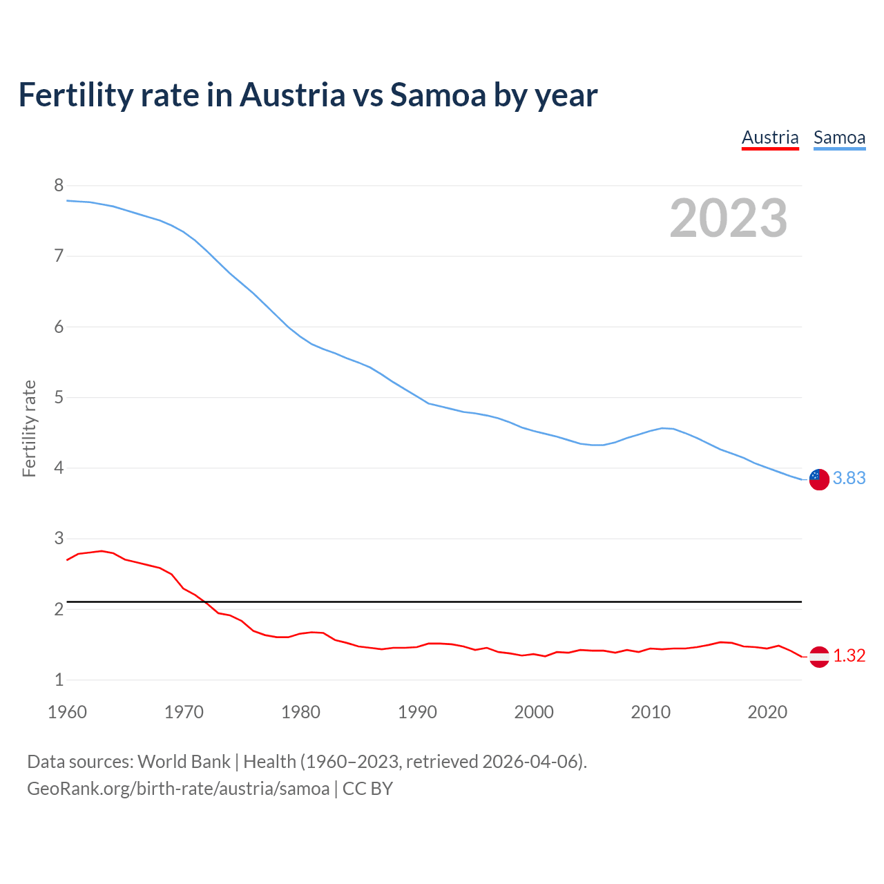 According to the latest available data on birth rates, the fertility rate in Austria was 1.32 children per woman in 2023, compared to 3.83 in Samoa in 2023. The replacement level is considered to be 2.1 children per woman.