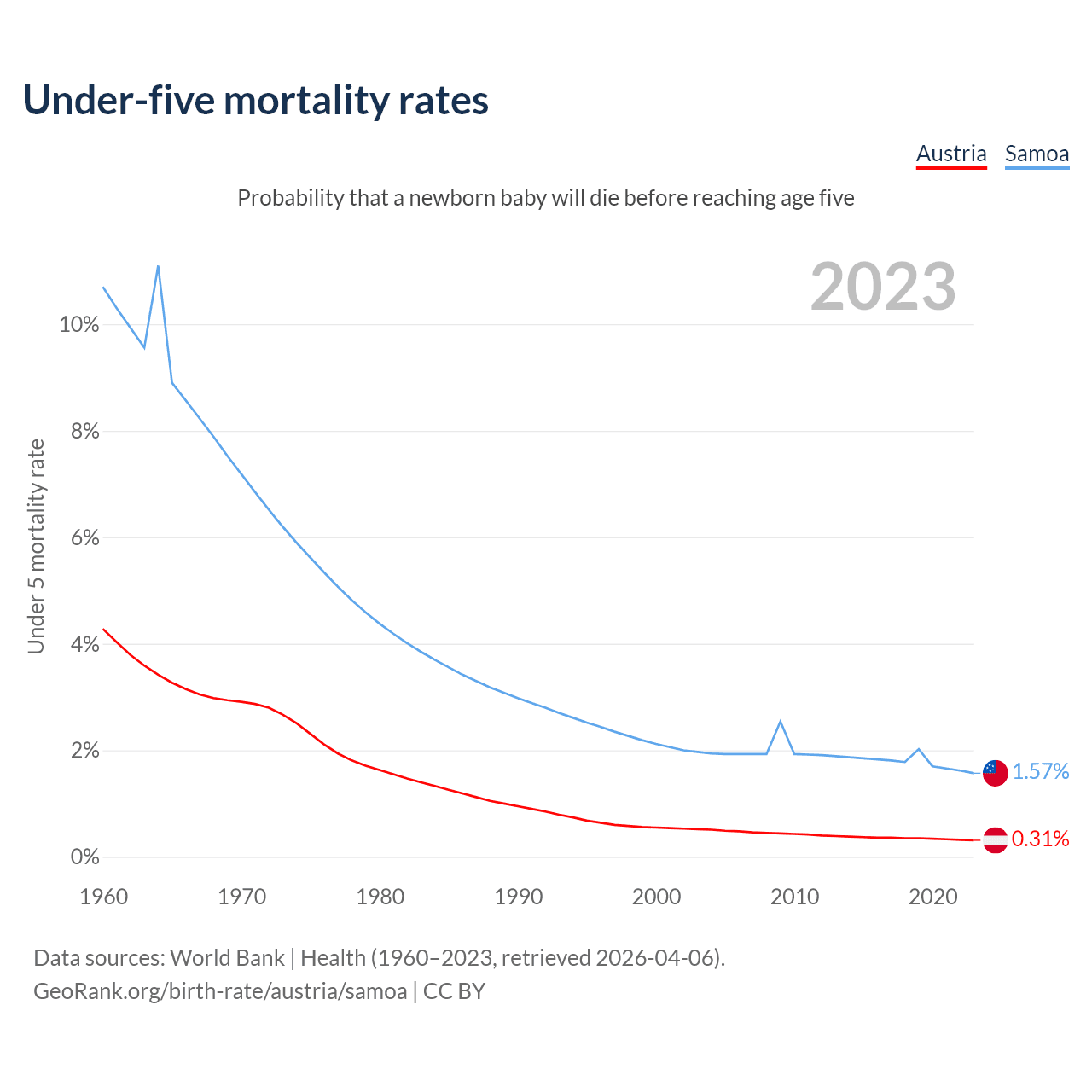 The chance that a newborn baby will die before reaching age five is 0.31% in Austria and 1.57% in Samoa. Above is a chart with historical data on under-five mortality rates.