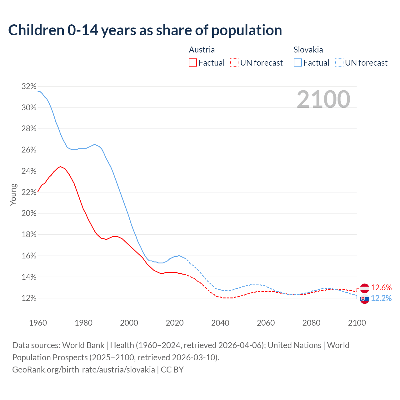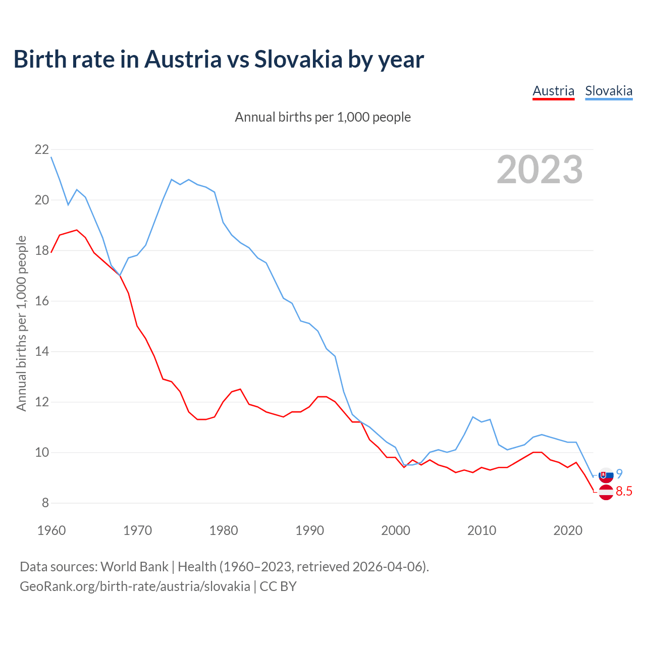 According to the latest available data on birth rates, the fertility rate in Austria was 1.32 children per woman in 2023, compared to 1.49 in Slovakia in 2023. The replacement level is considered to be 2.1 children per woman.