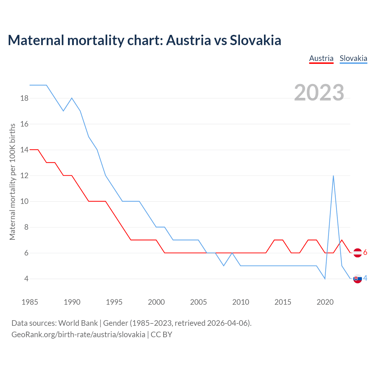 The maternal mortality rate, which is the probability of dying during childbirth or within 42 days of pregnancy termination, is 6 deaths per 100,000 live births in Austria, compared to 4 deaths in Slovakia.