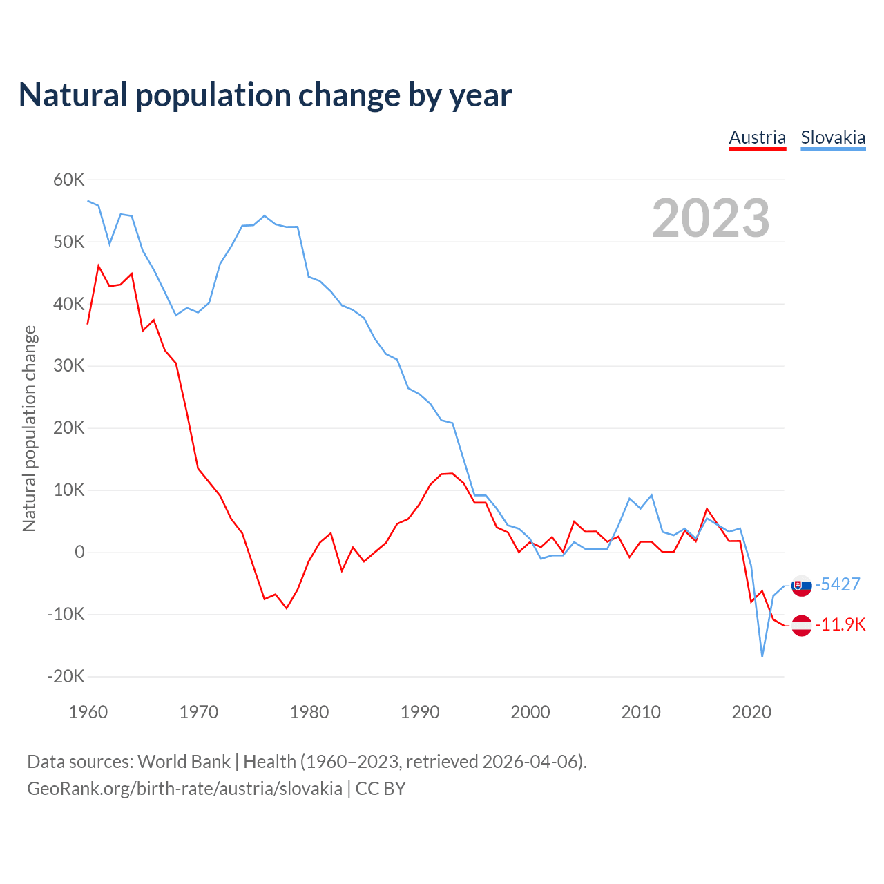 1960 vs 2023, the fertility rate has decreased by 50.9% in Austria and by 51% in Slovakia — in 1960, it was 2.69 and 3.04, respectively.