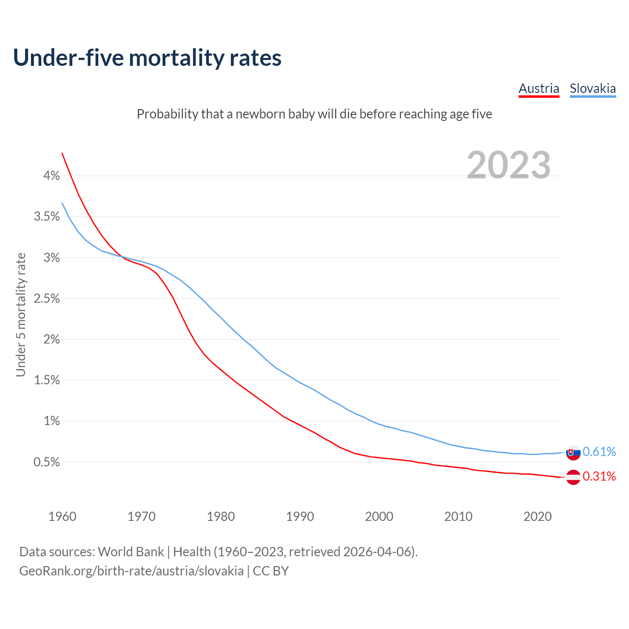 The chance that a newborn baby will die before reaching age five is 0.31% in Austria and 0.61% in Slovakia. Above is a chart with historical data on under-five mortality rates.
