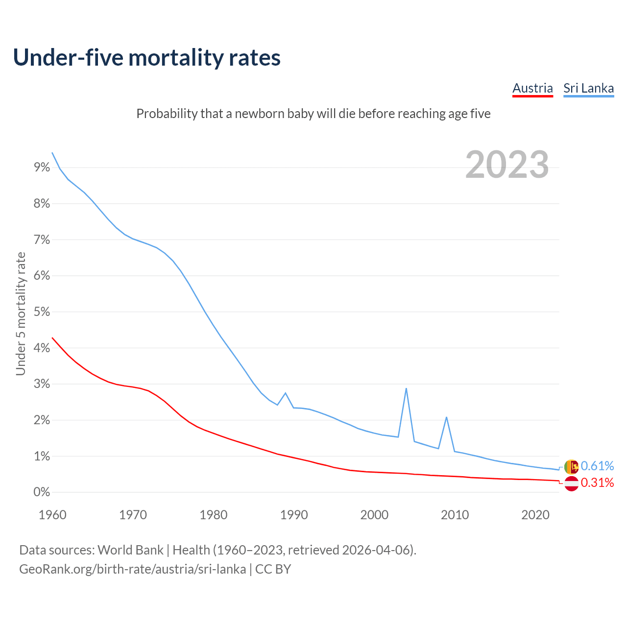 The chance that a newborn baby will die before reaching age five is 0.31% in Austria and 0.61% in Sri Lanka. Above is a chart with historical data on under-five mortality rates.