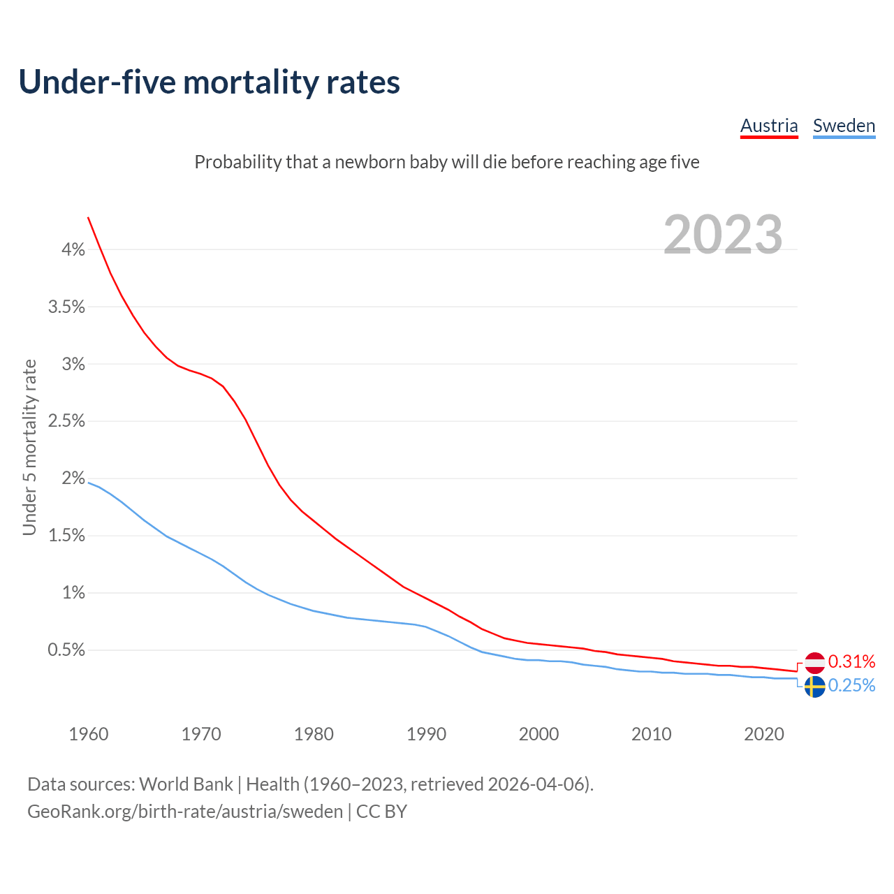The chance that a newborn baby will die before reaching age five is 0.31% in Austria and 0.25% in Sweden. Above is a chart with historical data on under-five mortality rates.