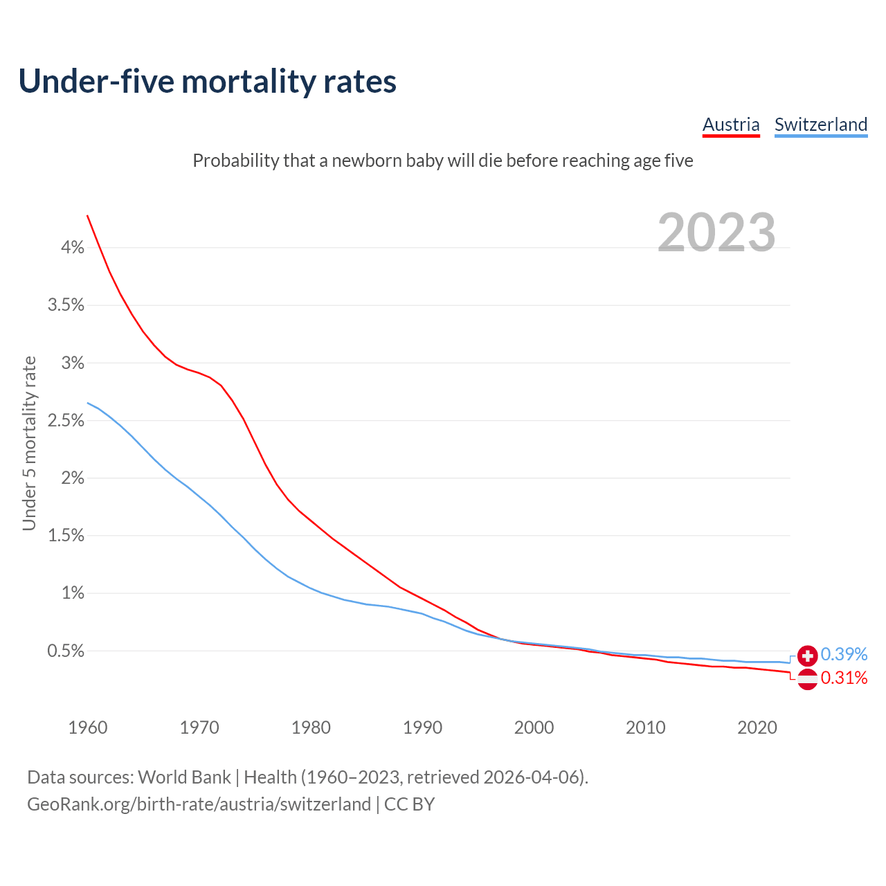 The chance that a newborn baby will die before reaching age five is 0.31% in Austria and 0.39% in Switzerland. Above is a chart with historical data on under-five mortality rates.
