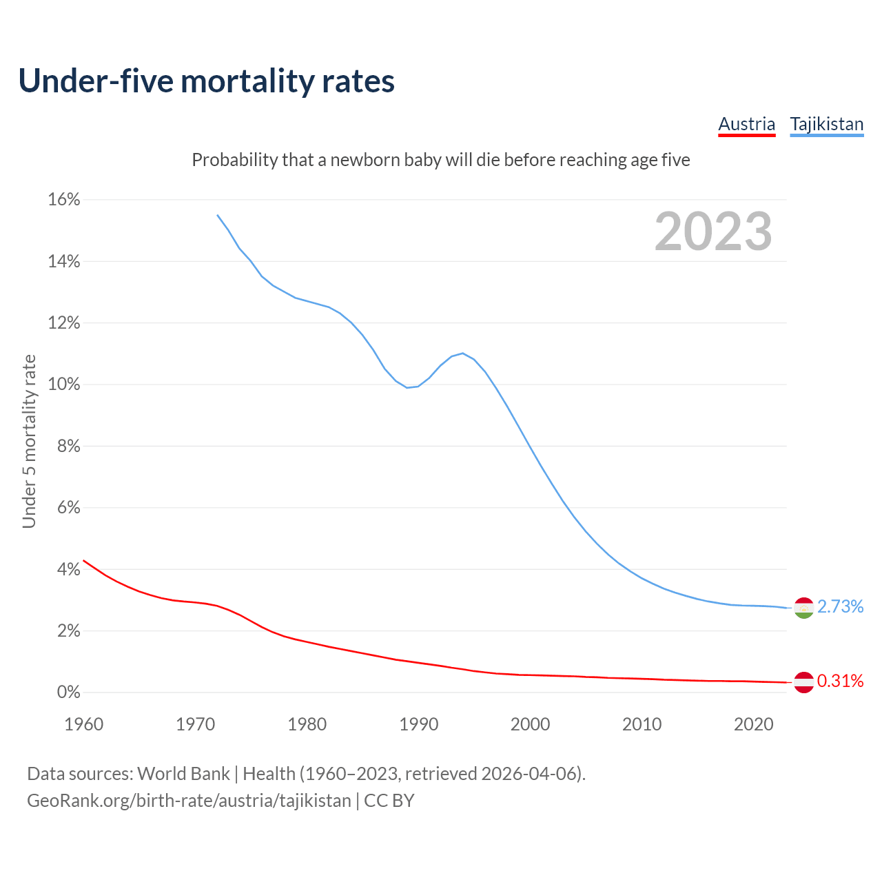 The chance that a newborn baby will die before reaching age five is 0.31% in Austria and 2.73% in Tajikistan. Above is a chart with historical data on under-five mortality rates.