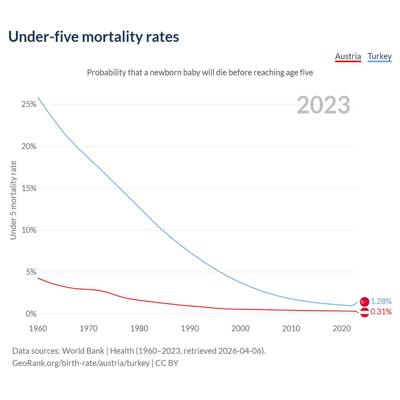 The chance that a newborn baby will die before reaching age five is 0.31% in Austria and 1.28% in Turkey. Above is a chart with historical data on under-five mortality rates.