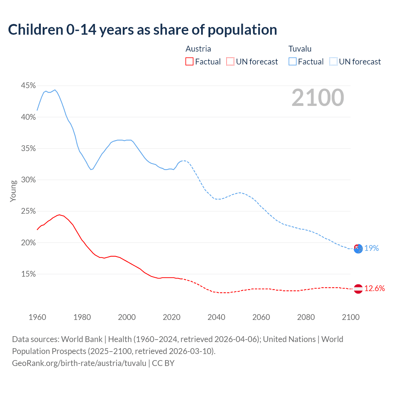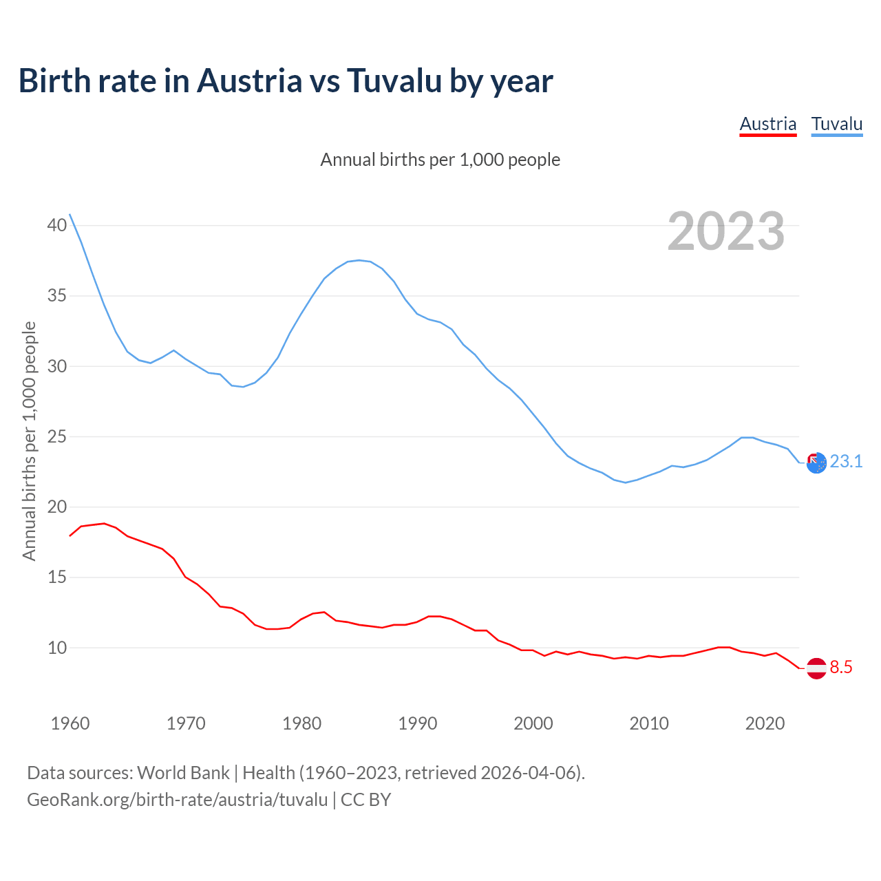 Austria has an annual birth rate of 8.5 births per 1,000 people, compared to 23.1 for Tuvalu. The average number of children a woman is expected to have during her lifetime — the fertility rate, is 1.32 in Austria and 3.21 in Tuvalu — 143% difference.