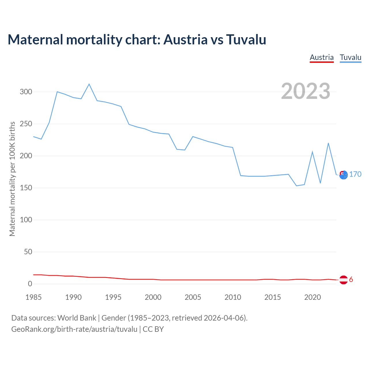 The maternal mortality rate, which is the probability of dying during childbirth or within 42 days of pregnancy termination, is 6 deaths per 100,000 live births in Austria, compared to 170 deaths in Tuvalu.