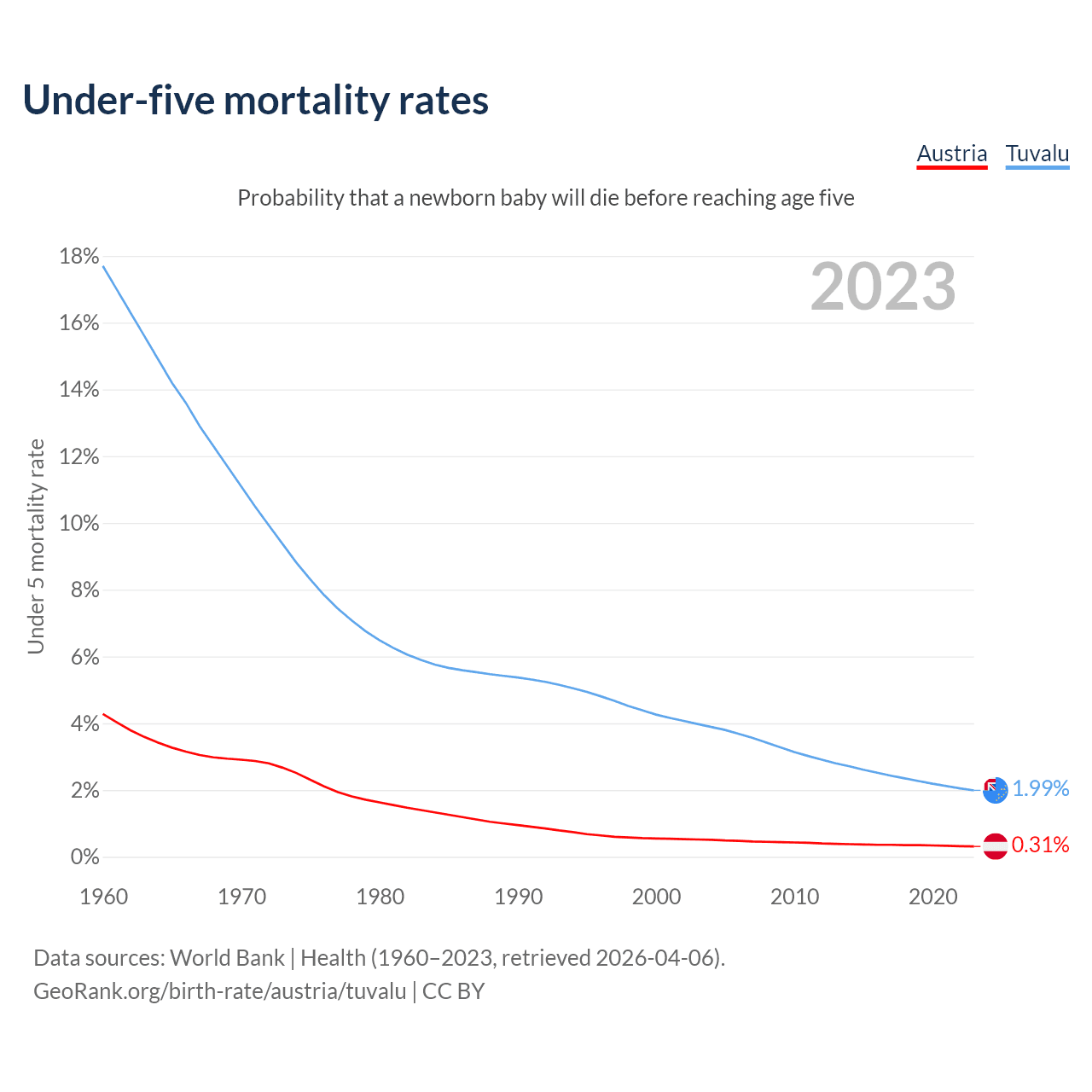 The chance that a newborn baby will die before reaching age five is 0.31% in Austria and 1.99% in Tuvalu. Above is a chart with historical data on under-five mortality rates.