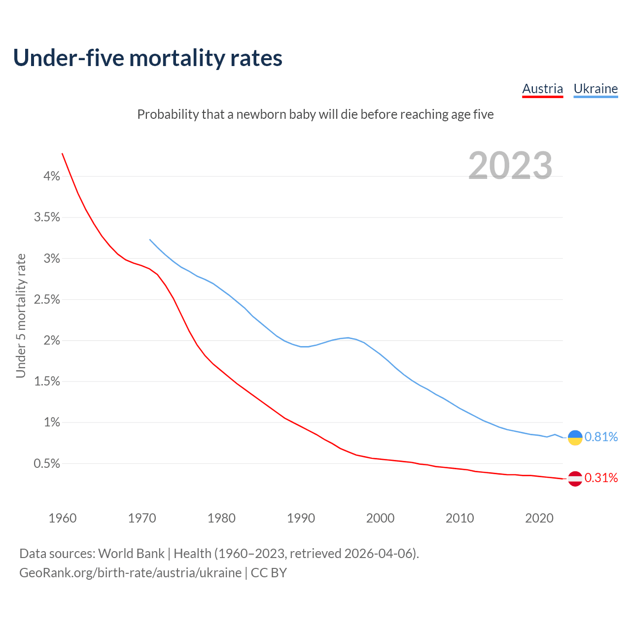 The chance that a newborn baby will die before reaching age five is 0.31% in Austria and 0.81% in Ukraine. Above is a chart with historical data on under-five mortality rates.