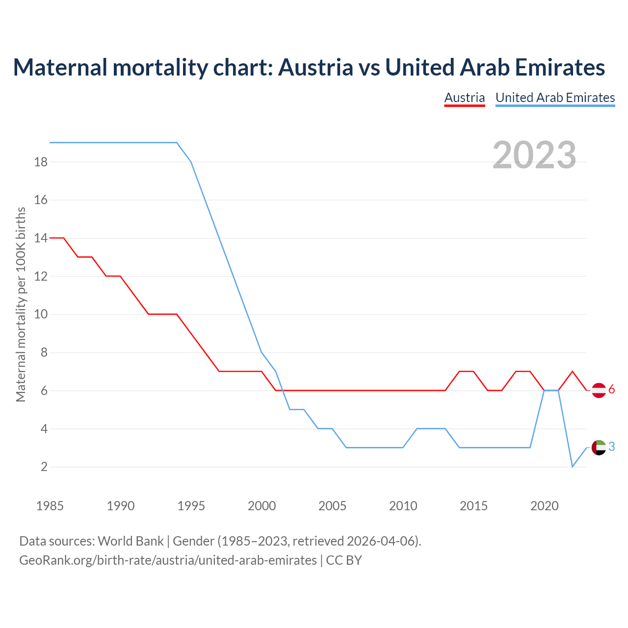 The maternal mortality rate, which is the probability of dying during childbirth or within 42 days of pregnancy termination, is 6 deaths per 100,000 live births in Austria, compared to 3 deaths in the United Arab Emirates.
