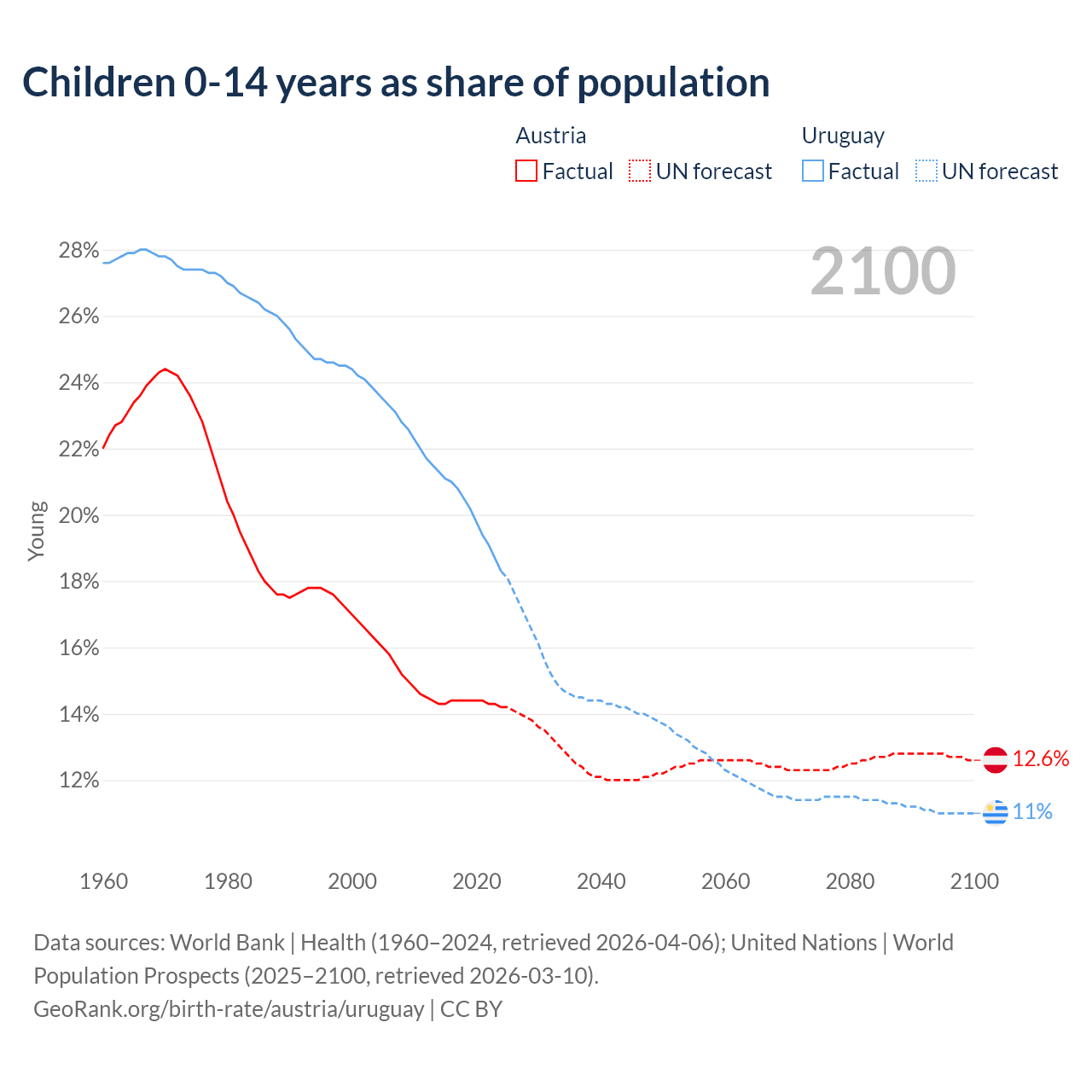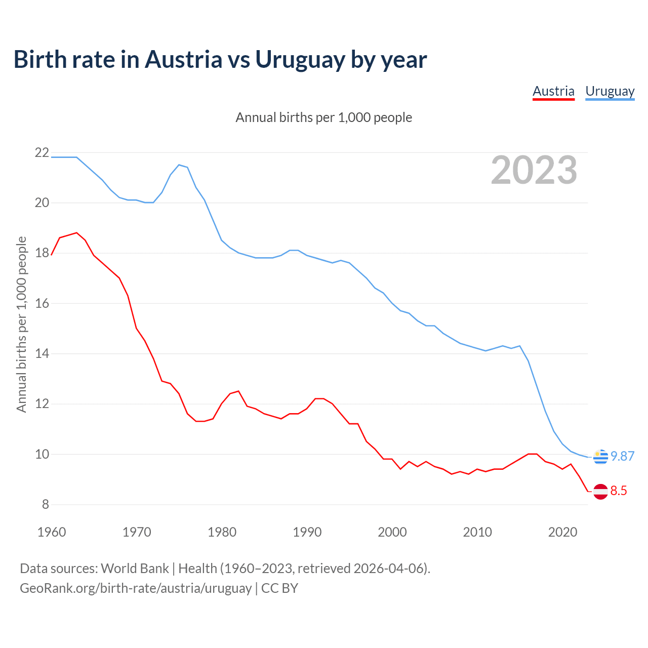 According to the latest available data on birth rates, the fertility rate in Austria was 1.32 children per woman in 2023, compared to 1.41 in Uruguay in 2023. The replacement level is considered to be 2.1 children per woman.