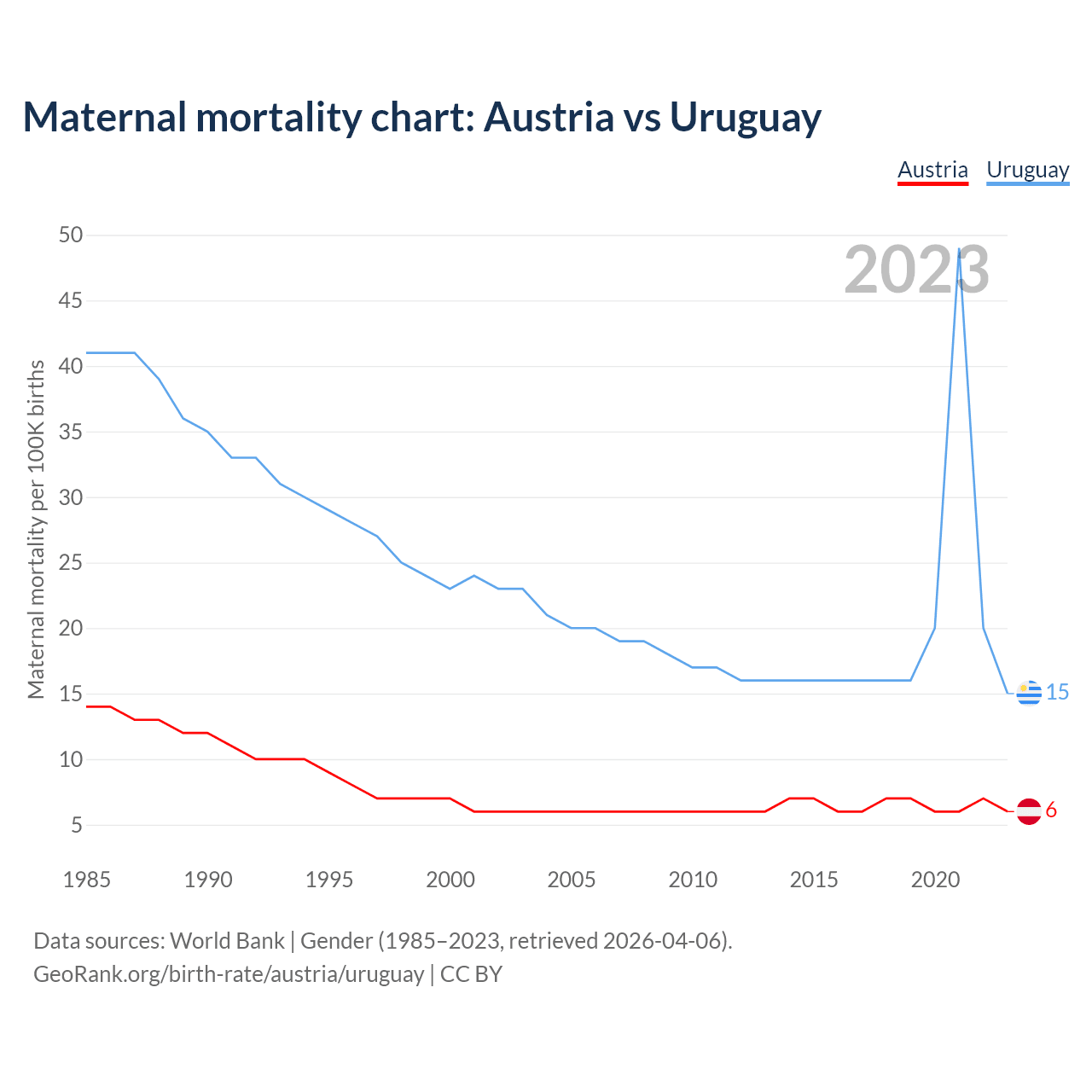The maternal mortality rate, which is the probability of dying during childbirth or within 42 days of pregnancy termination, is 6 deaths per 100,000 live births in Austria, compared to 15 deaths in Uruguay.