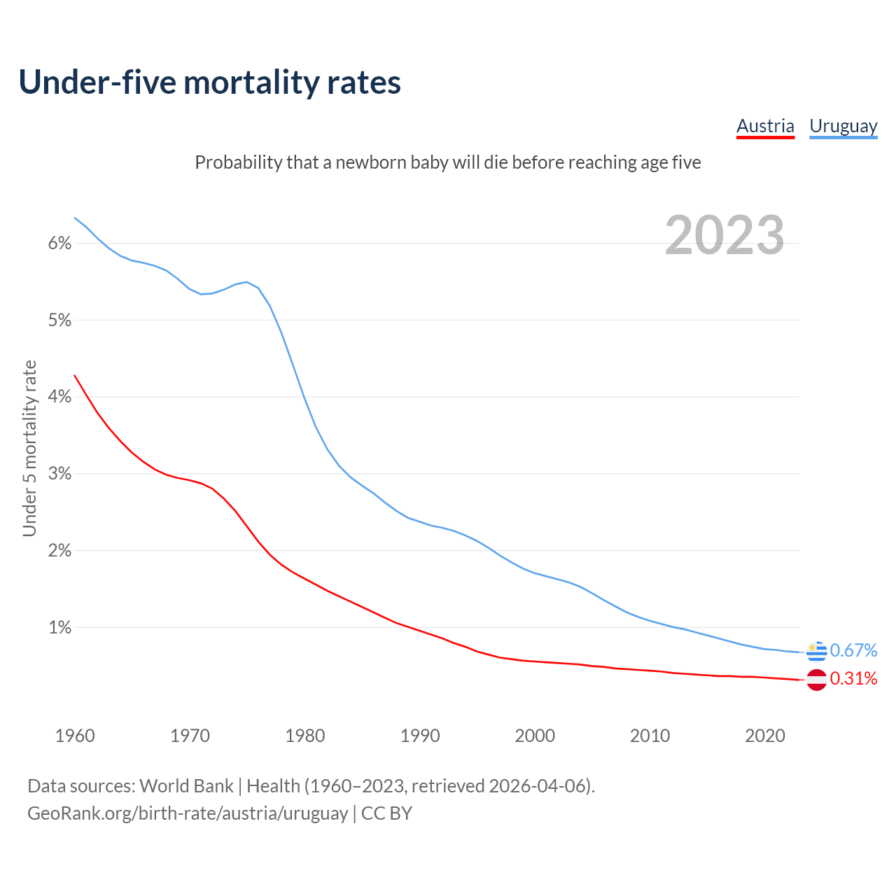 The chance that a newborn baby will die before reaching age five is 0.31% in Austria and 0.67% in Uruguay. Above is a chart with historical data on under-five mortality rates.