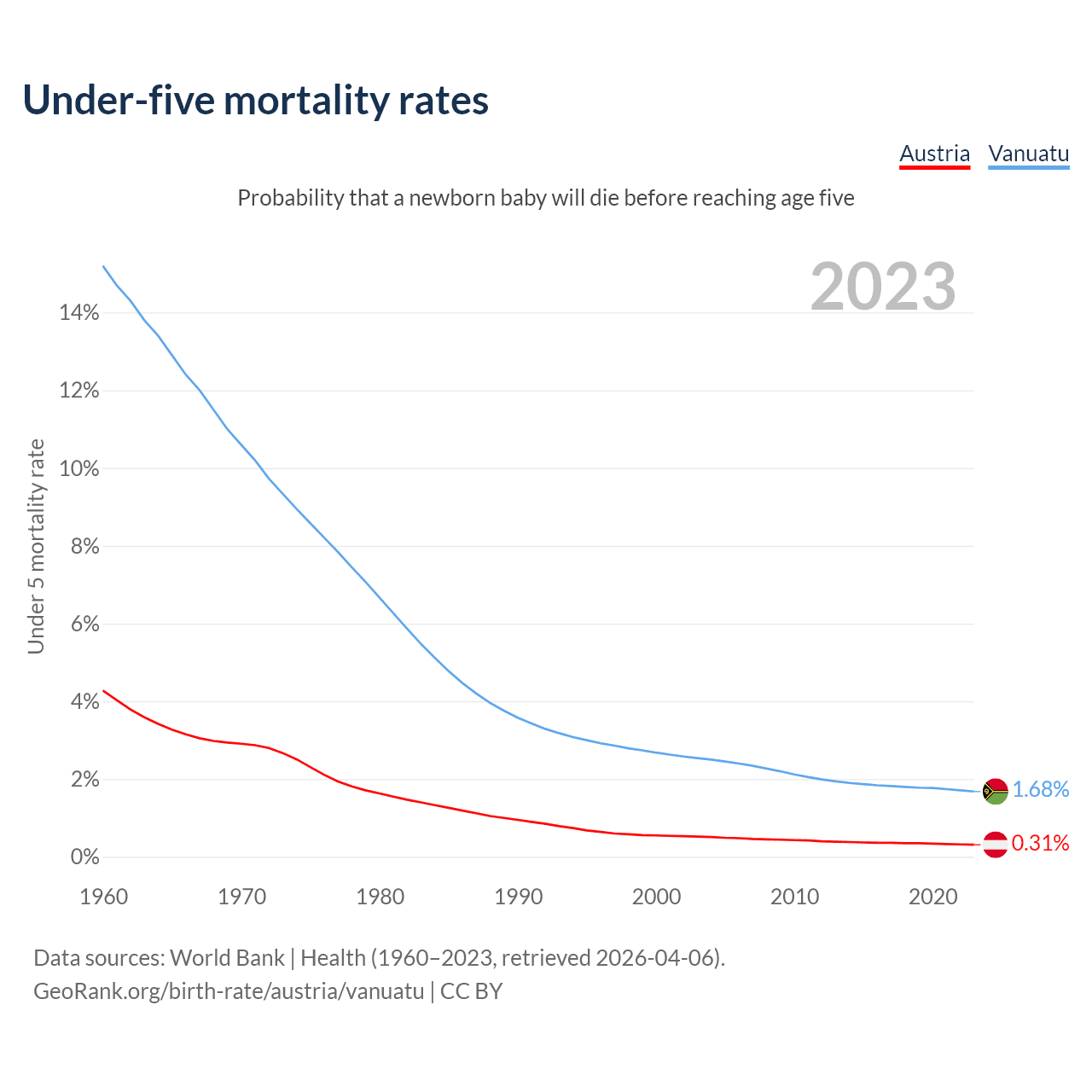 The chance that a newborn baby will die before reaching age five is 0.31% in Austria and 1.68% in Vanuatu. Above is a chart with historical data on under-five mortality rates.