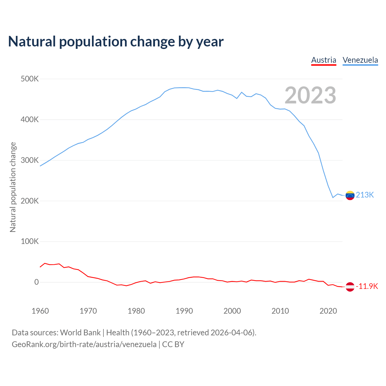 According to the latest available data on birth rates, the fertility rate in Austria was 1.32 children per woman in 2023, compared to 2.08 in Venezuela in 2023. The replacement level is considered to be 2.1 children per woman.