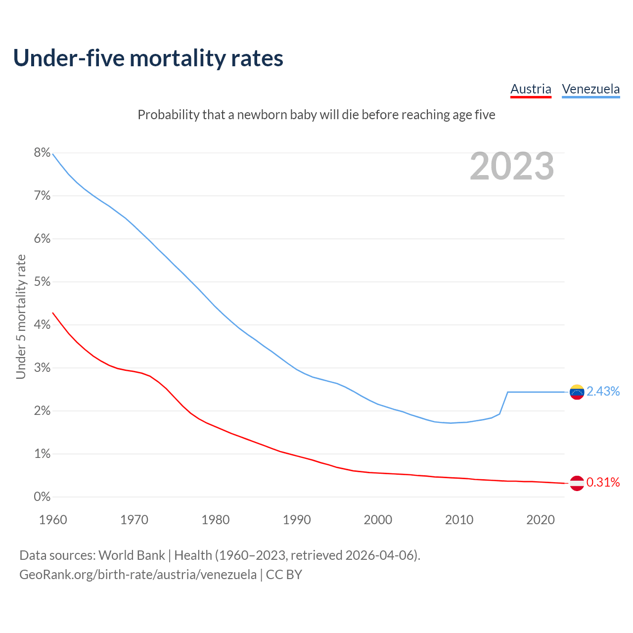 The chance that a newborn baby will die before reaching age five is 0.31% in Austria and 2.43% in Venezuela. Above is a chart with historical data on under-five mortality rates.