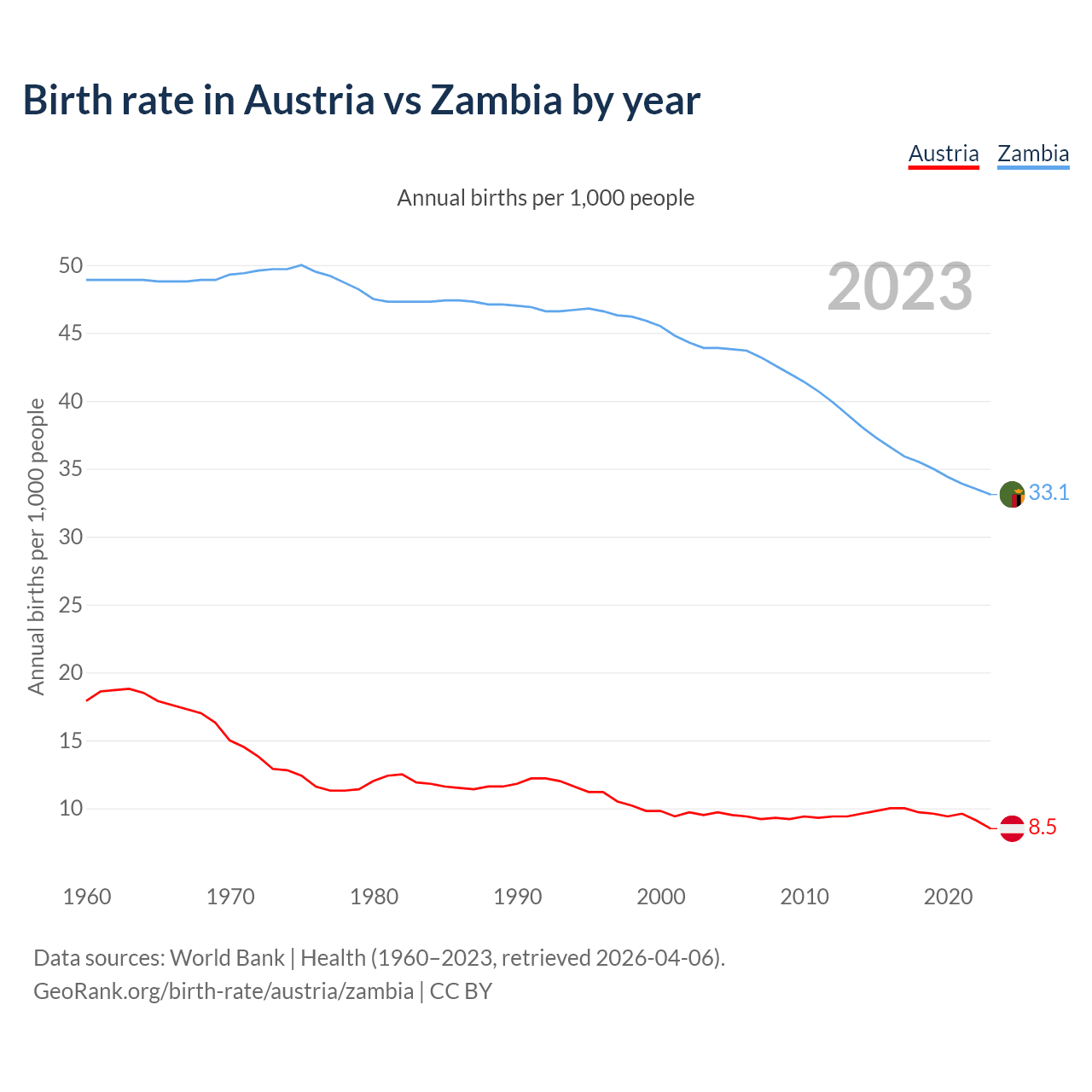Austria has an annual birth rate of 8.5 births per 1,000 people, compared to 33.1 for Zambia. The average number of children a woman is expected to have during her lifetime — the fertility rate, is 1.32 in Austria and 4.1 in Zambia — 210.7% difference.