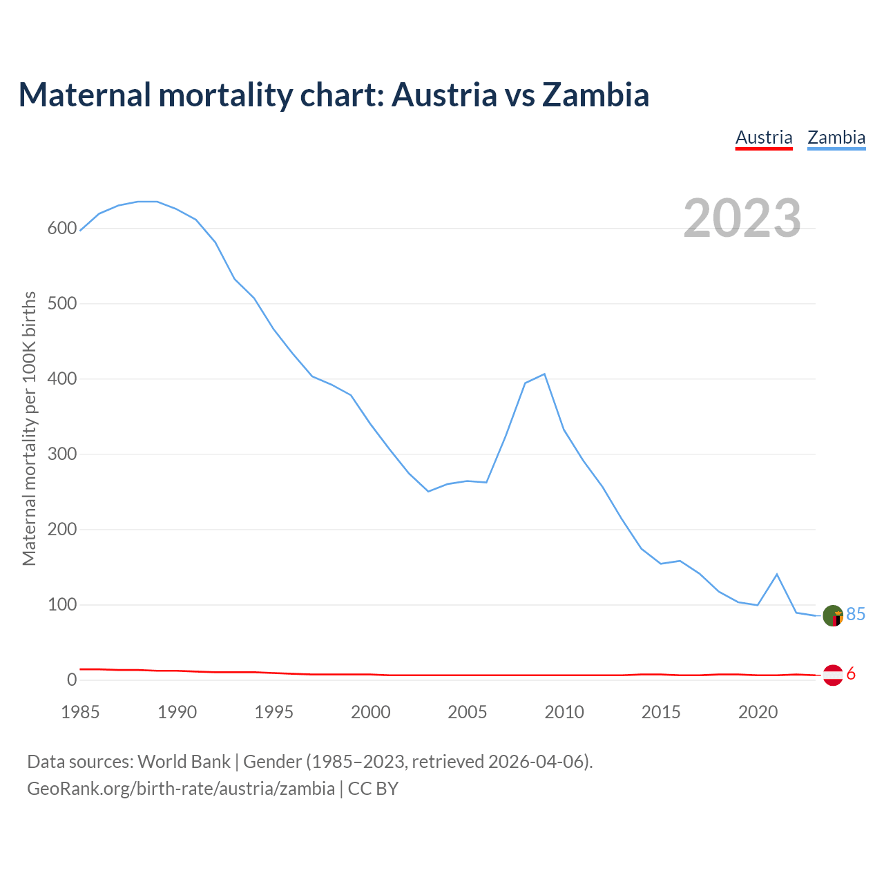 The maternal mortality rate, which is the probability of dying during childbirth or within 42 days of pregnancy termination, is 6 deaths per 100,000 live births in Austria, compared to 85 deaths in Zambia.