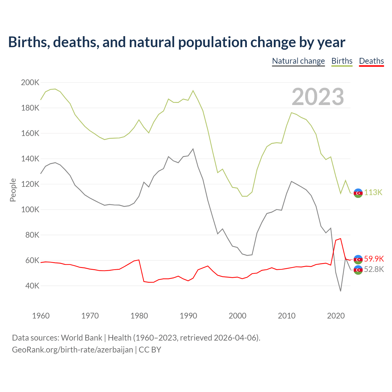 According to the latest birth rate data available, the fertility rate in Azerbaijan was 1.55 in 2023 and has been below the replacement level of 2.1 children per woman since 1996. In 1993, the fertility rate was 2.7 — a 42.6% decline in 30 years.
