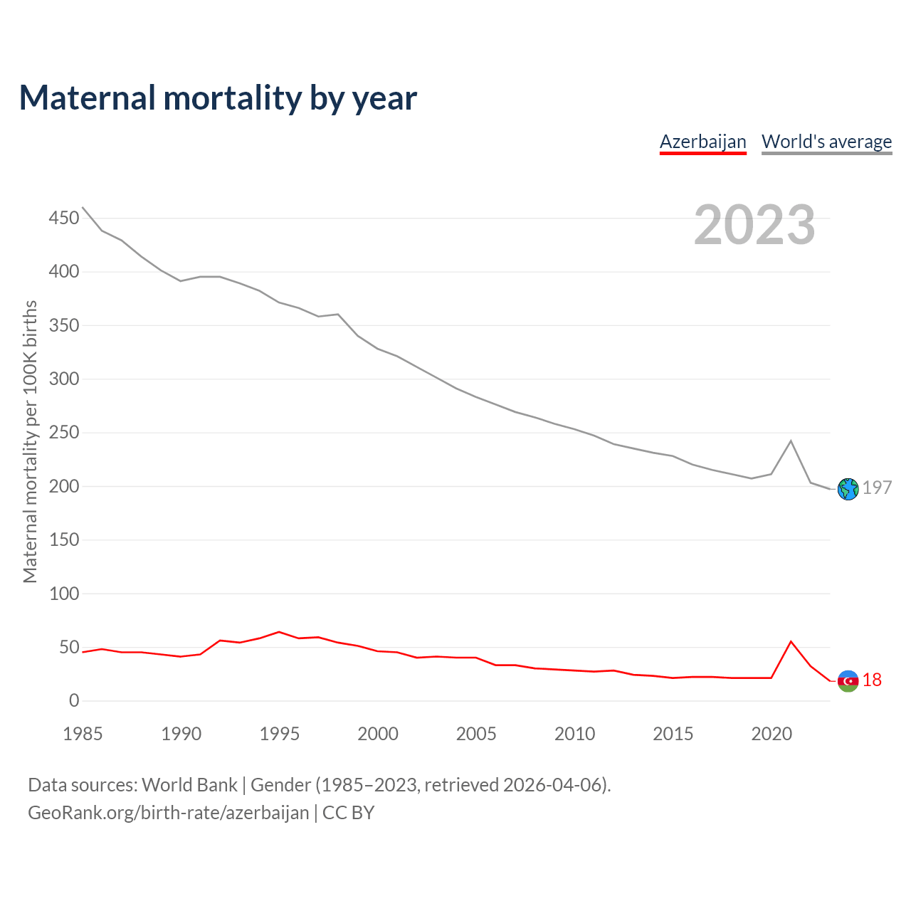 The maternal mortality rate in Azerbaijan was 18 deaths per 100,000 live births in 2023 — a 0.02% chance of dying during childbirth or within 42 days of pregnancy termination. This is a 60.9% decrease compared to the year 2000.