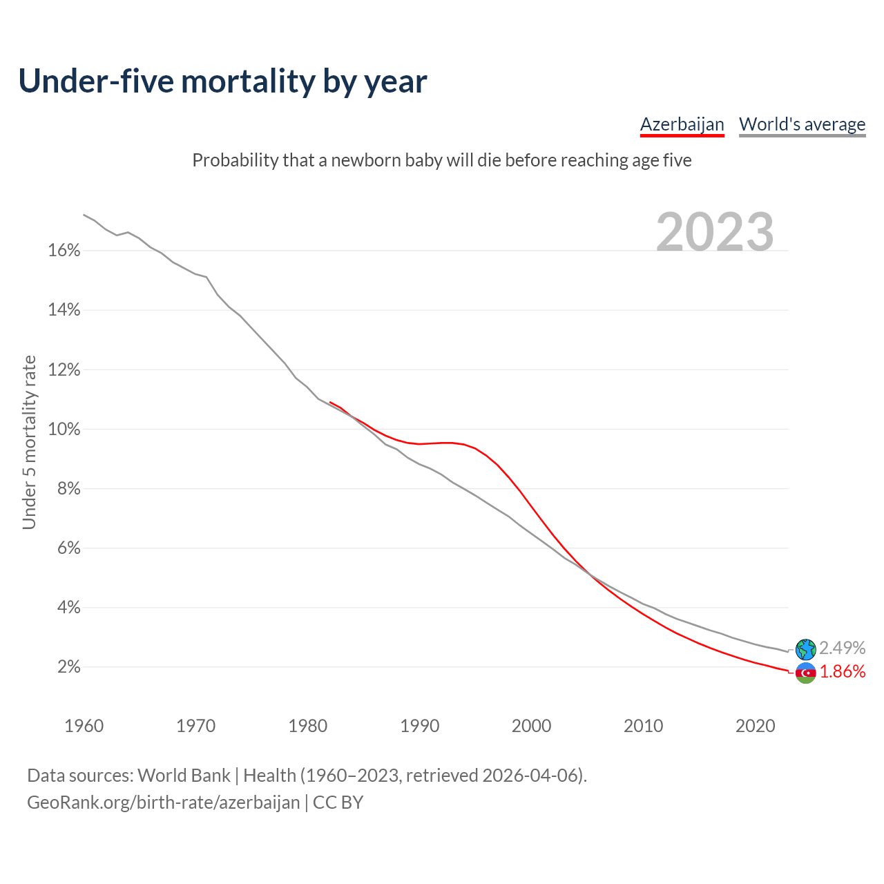 The under-5 mortality rate in Azerbaijan was 18.6 deaths per 1,000 live births in 2023 — a 1.86% chance that a newborn baby will die before reaching age five. This is down from 74 deaths per 1,000 live births in 2000.