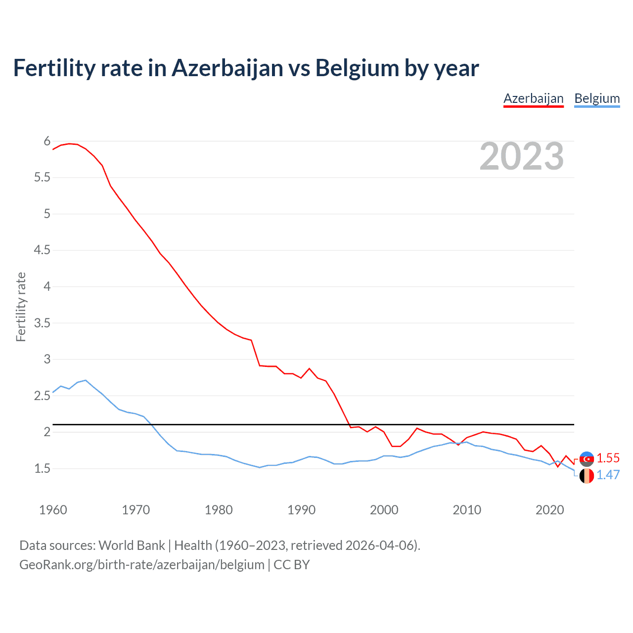 According to the latest available data on birth rates, the fertility rate in Azerbaijan was 1.55 children per woman in 2023, compared to 1.47 in Belgium in 2023. The replacement level is considered to be 2.1 children per woman.