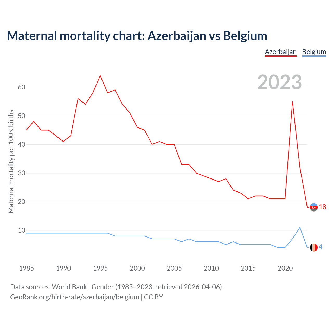 The maternal mortality rate, which is the probability of dying during childbirth or within 42 days of pregnancy termination, is 18 deaths per 100,000 live births in Azerbaijan, compared to 4 deaths in Belgium.