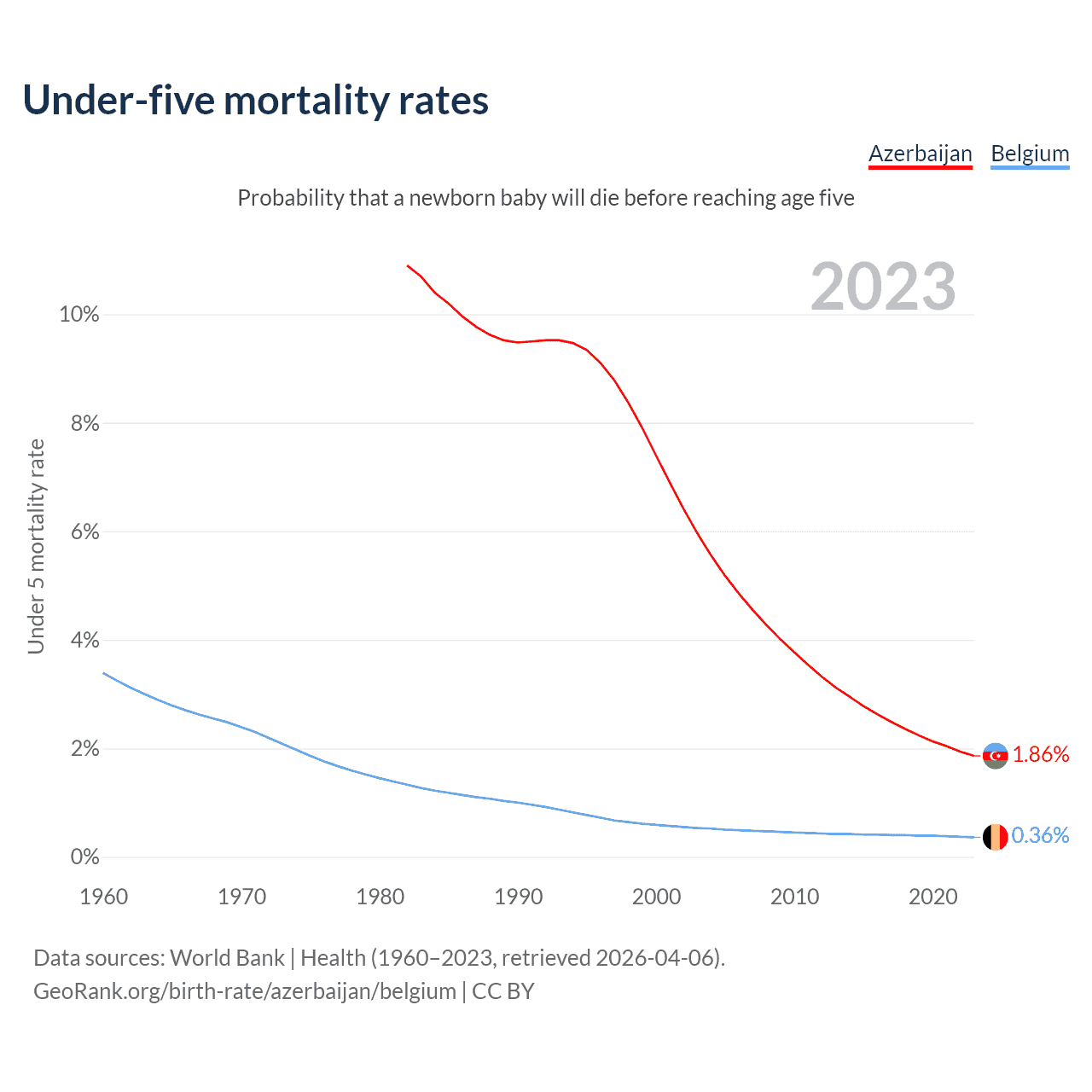 The chance that a newborn baby will die before reaching age five is 1.86% in Azerbaijan and 0.36% in Belgium. Above is a chart with historical data on under-five mortality rates.