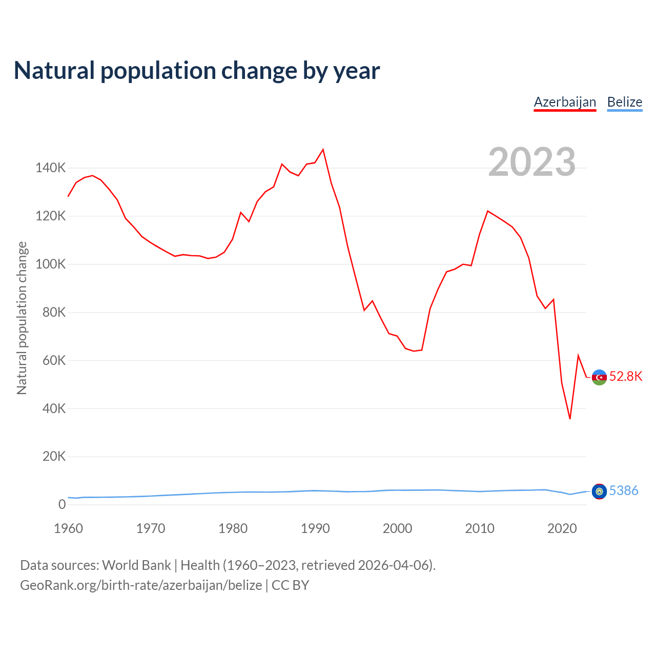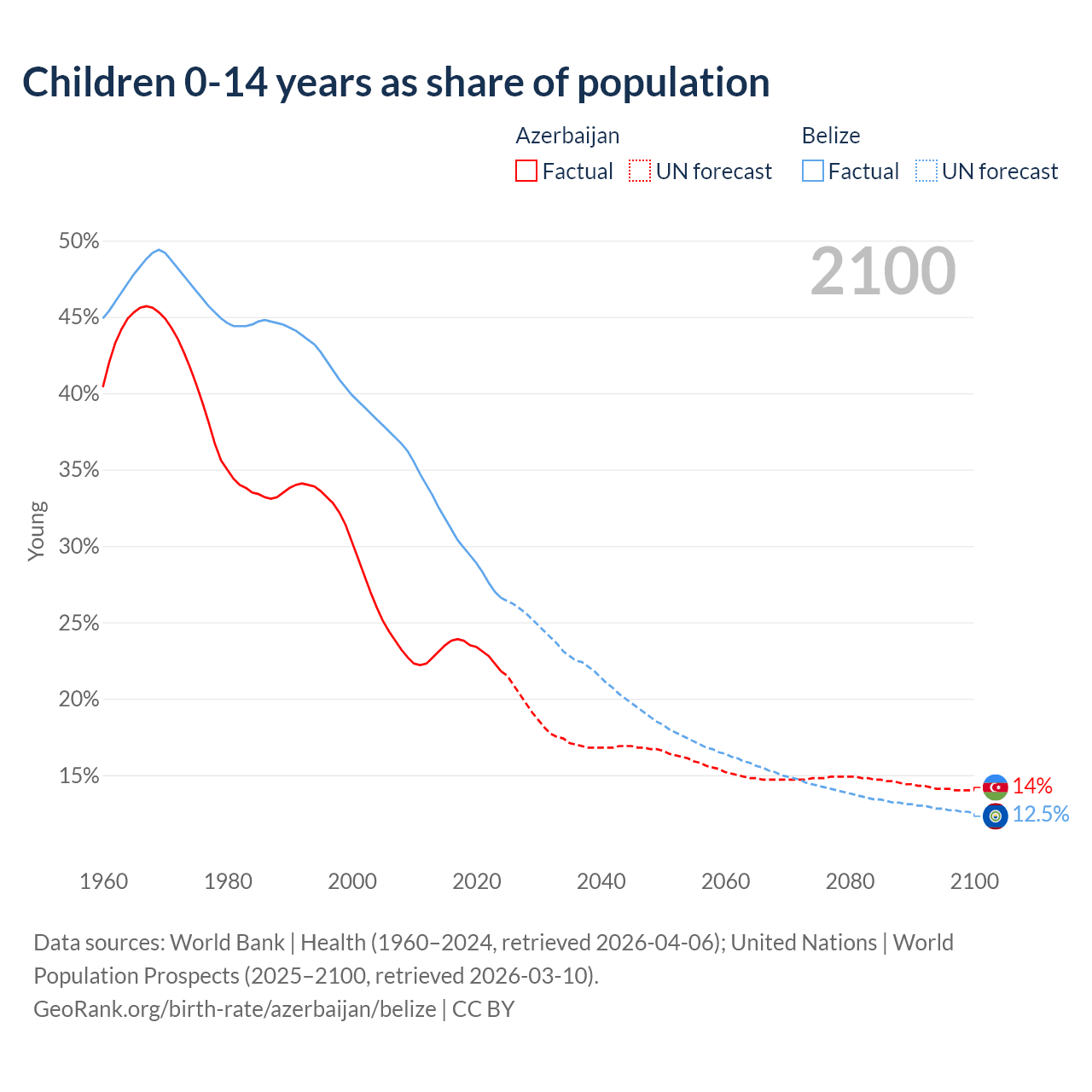 According to the latest available data on birth rates, the fertility rate in Azerbaijan was 1.55 children per woman in 2023, compared to 2.01 in Belize in 2023. The replacement level is considered to be 2.1 children per woman.