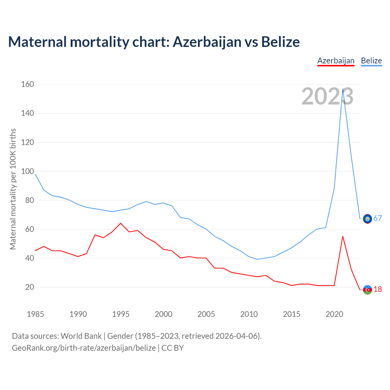The maternal mortality rate, which is the probability of dying during childbirth or within 42 days of pregnancy termination, is 18 deaths per 100,000 live births in Azerbaijan, compared to 67 deaths in Belize.