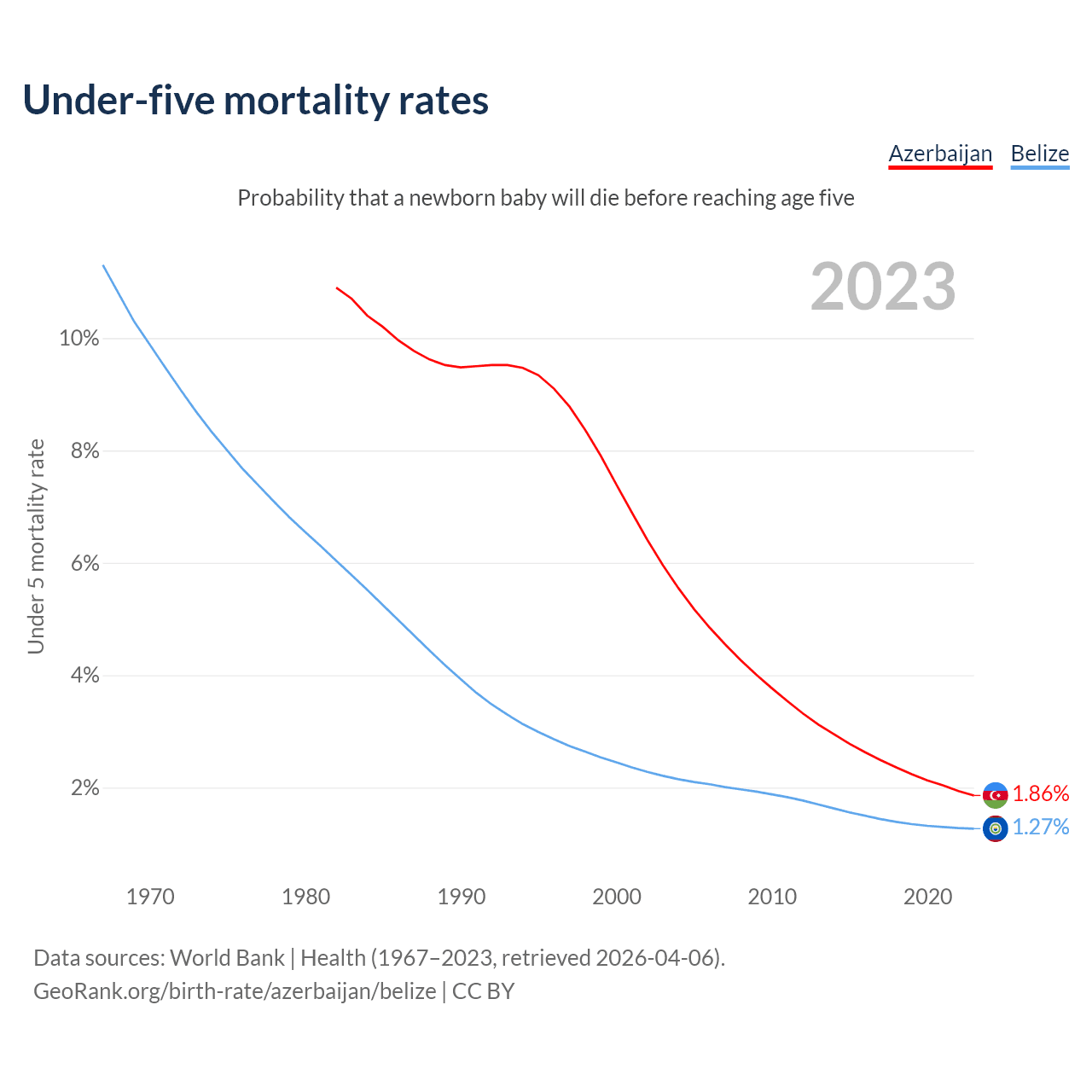 The chance that a newborn baby will die before reaching age five is 1.86% in Azerbaijan and 1.27% in Belize. Above is a chart with historical data on under-five mortality rates.