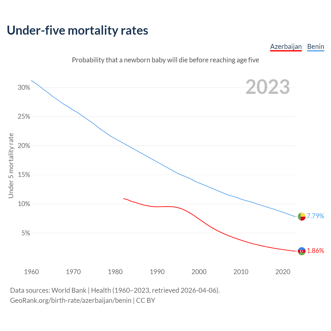 The chance that a newborn baby will die before reaching age five is 1.86% in Azerbaijan and 7.79% in Benin. Above is a chart with historical data on under-five mortality rates.