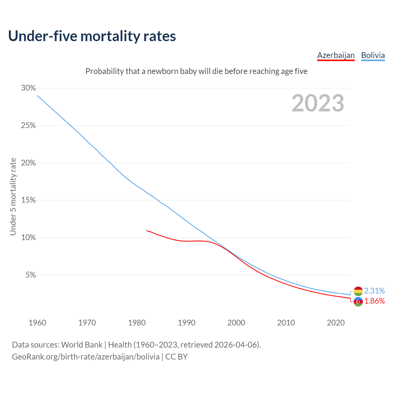 The chance that a newborn baby will die before reaching age five is 1.86% in Azerbaijan and 2.31% in Bolivia. Above is a chart with historical data on under-five mortality rates.