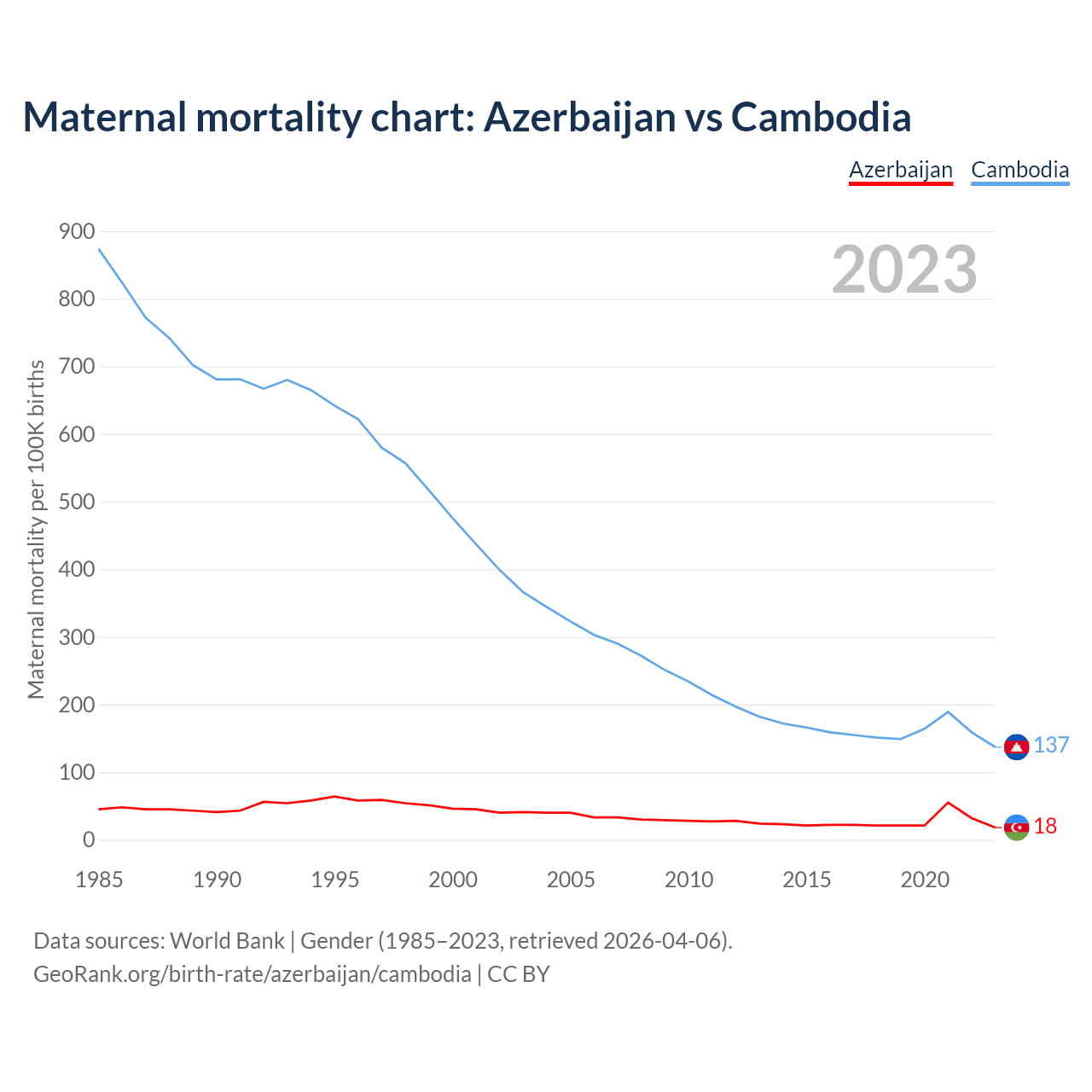 The maternal mortality rate, which is the probability of dying during childbirth or within 42 days of pregnancy termination, is 18 deaths per 100,000 live births in Azerbaijan, compared to 137 deaths in Cambodia.
