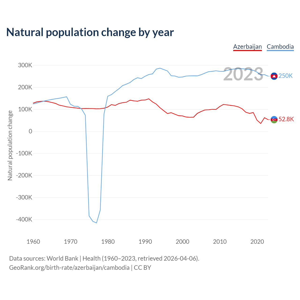 According to the latest available data on birth rates, the fertility rate in Azerbaijan was 1.55 children per woman in 2023, compared to 2.58 in Cambodia in 2023. The replacement level is considered to be 2.1 children per woman.