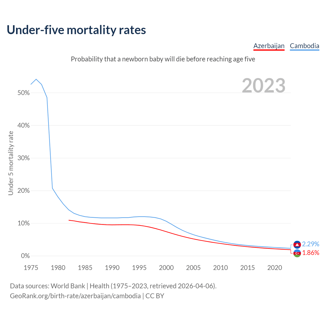 The chance that a newborn baby will die before reaching age five is 1.86% in Azerbaijan and 2.29% in Cambodia. Above is a chart with historical data on under-five mortality rates.