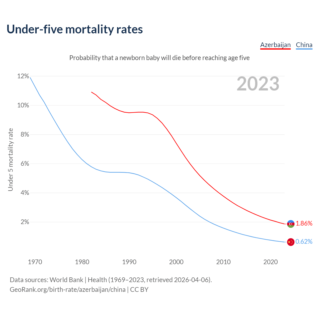 The chance that a newborn baby will die before reaching age five is 1.86% in Azerbaijan and 0.62% in China. Above is a chart with historical data on under-five mortality rates.