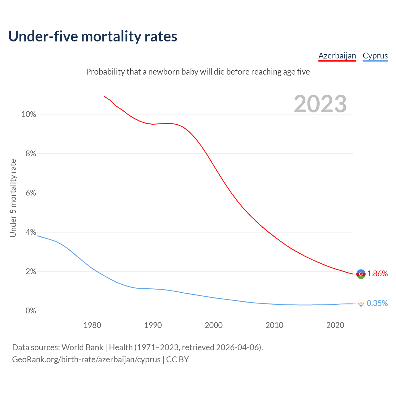 The chance that a newborn baby will die before reaching age five is 1.86% in Azerbaijan and 0.35% in Cyprus. Above is a chart with historical data on under-five mortality rates.