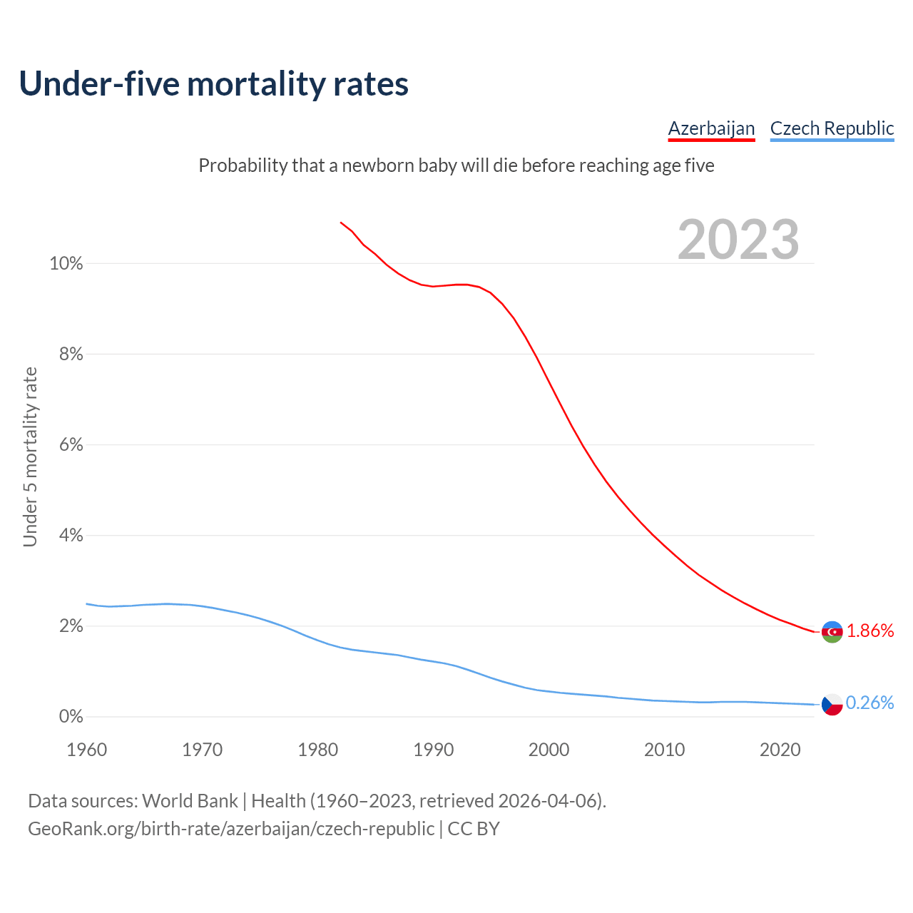 The chance that a newborn baby will die before reaching age five is 1.86% in Azerbaijan and 0.26% in the Czech Republic. Above is a chart with historical data on under-five mortality rates.