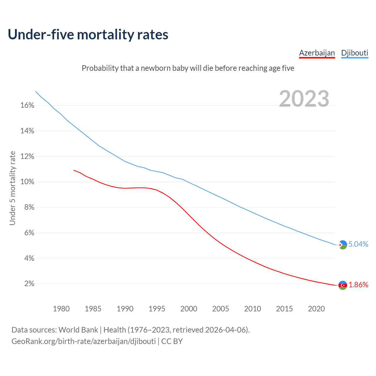 The chance that a newborn baby will die before reaching age five is 1.86% in Azerbaijan and 5.04% in Djibouti. Above is a chart with historical data on under-five mortality rates.