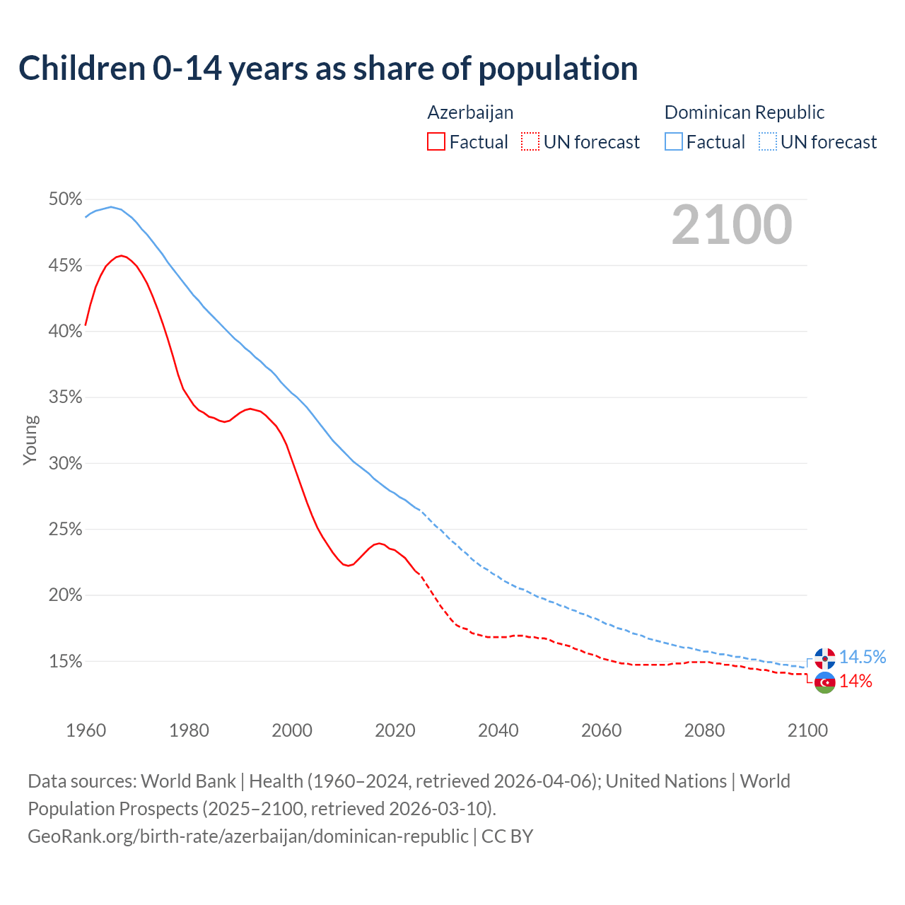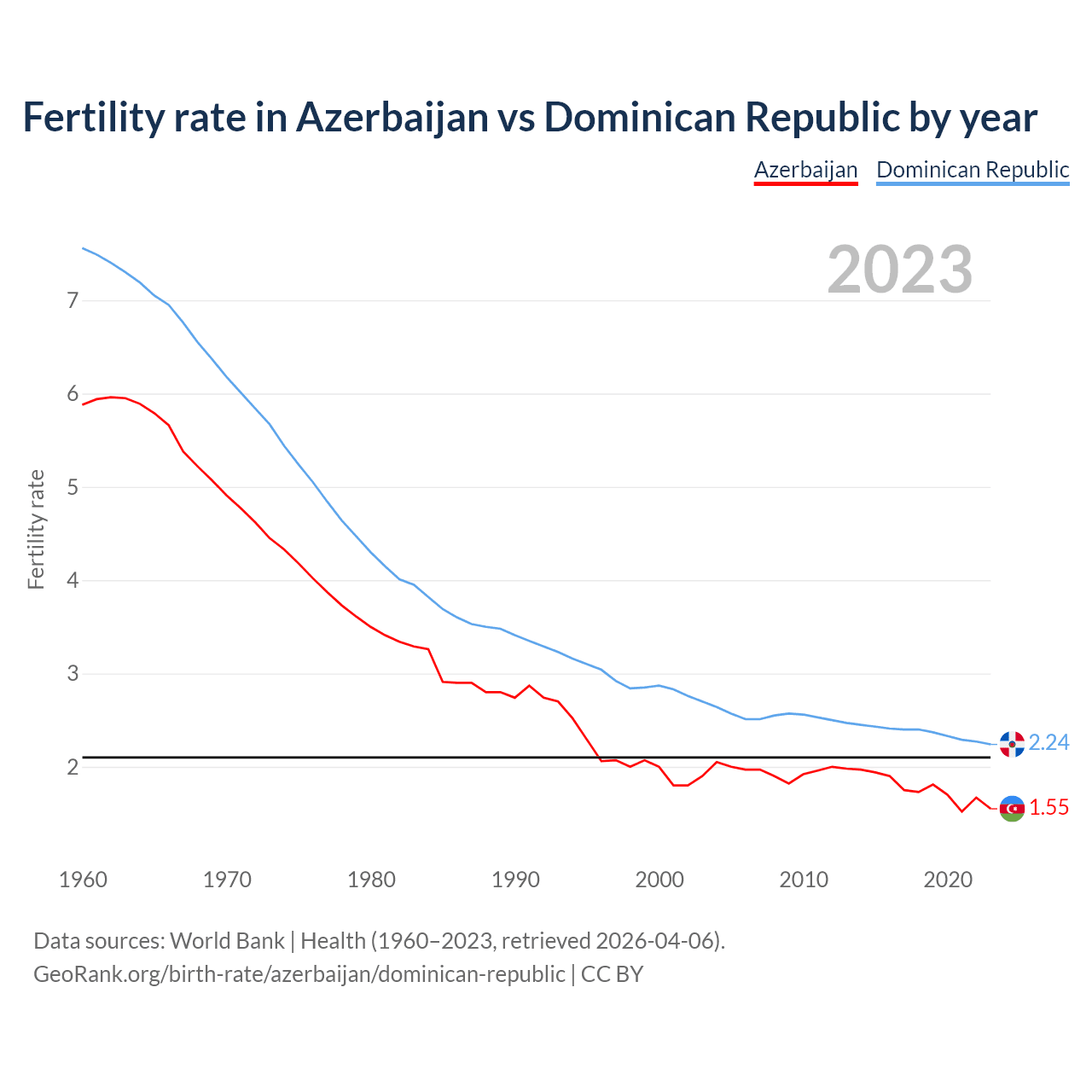According to the latest available data on birth rates, the fertility rate in Azerbaijan was 1.55 children per woman in 2023, compared to 2.24 in the Dominican Republic in 2023. The replacement level is considered to be 2.1 children per woman.