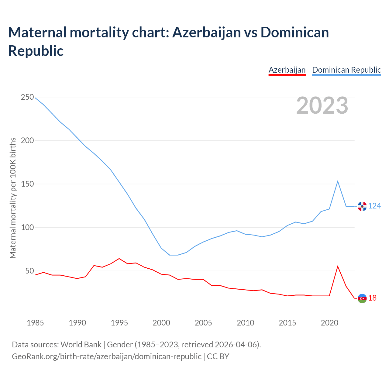 The maternal mortality rate, which is the probability of dying during childbirth or within 42 days of pregnancy termination, is 18 deaths per 100,000 live births in Azerbaijan, compared to 124 deaths in the Dominican Republic.