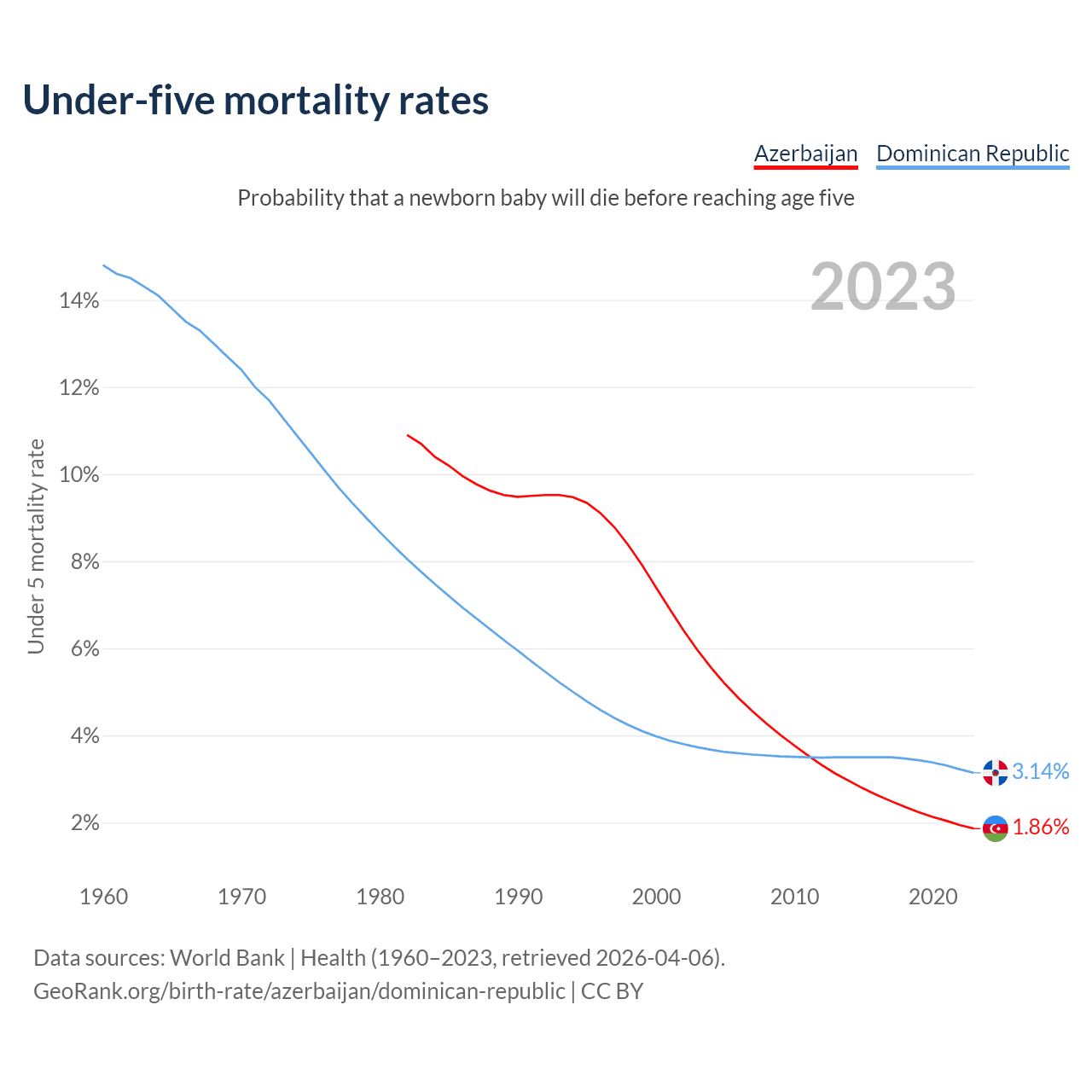 The chance that a newborn baby will die before reaching age five is 1.86% in Azerbaijan and 3.14% in the Dominican Republic. Above is a chart with historical data on under-five mortality rates.