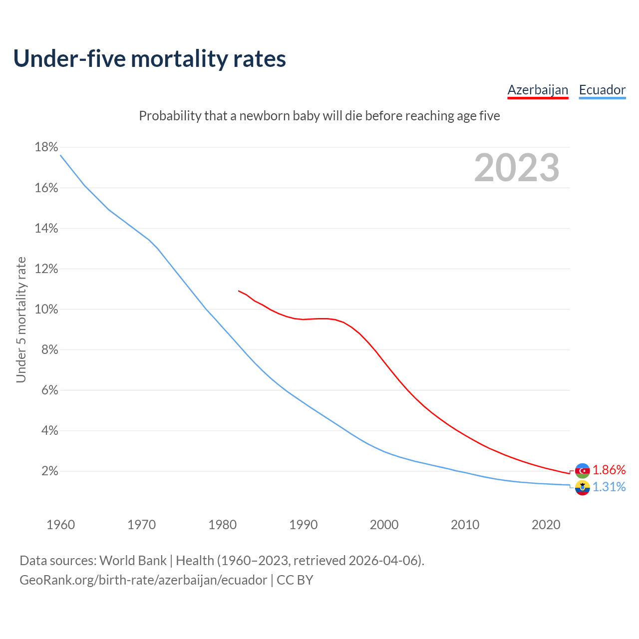 The chance that a newborn baby will die before reaching age five is 1.86% in Azerbaijan and 1.31% in Ecuador. Above is a chart with historical data on under-five mortality rates.