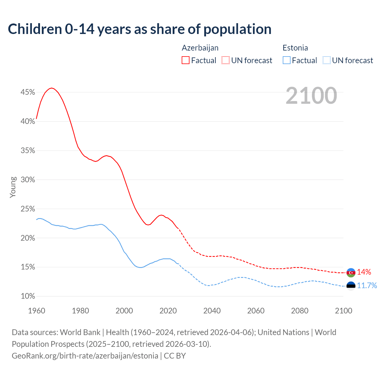 Azerbaijan has an annual birth rate of 11.1 births per 1,000 people, compared to 8 for Estonia. The average number of children a woman is expected to have during her lifetime — the fertility rate, is 1.55 in Azerbaijan and 1.31 in Estonia — 15.5% difference.