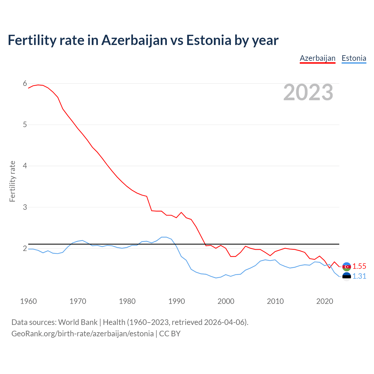 According to the latest available data on birth rates, the fertility rate in Azerbaijan was 1.55 children per woman in 2023, compared to 1.31 in Estonia in 2023. The replacement level is considered to be 2.1 children per woman.