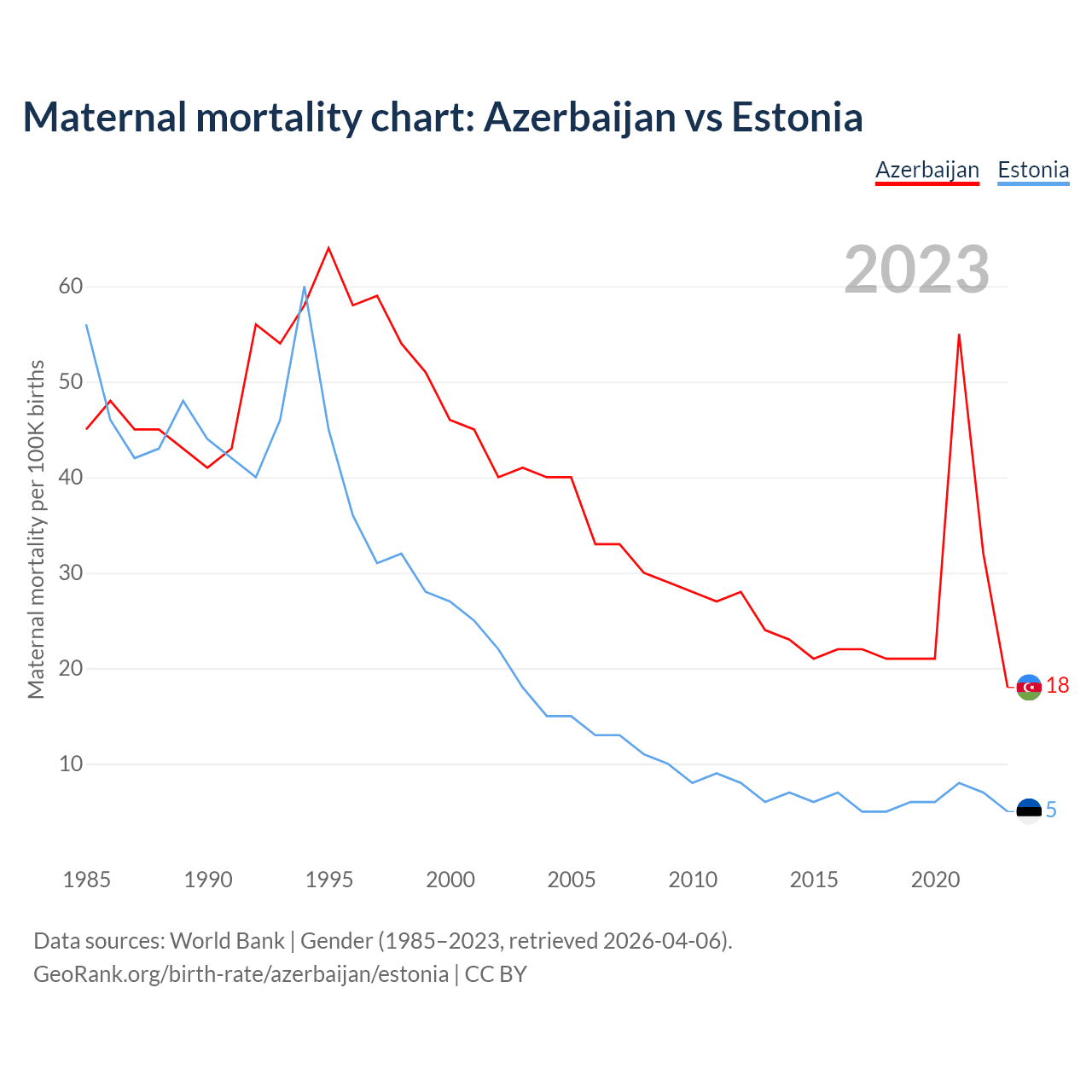 The maternal mortality rate, which is the probability of dying during childbirth or within 42 days of pregnancy termination, is 18 deaths per 100,000 live births in Azerbaijan, compared to 5 deaths in Estonia.