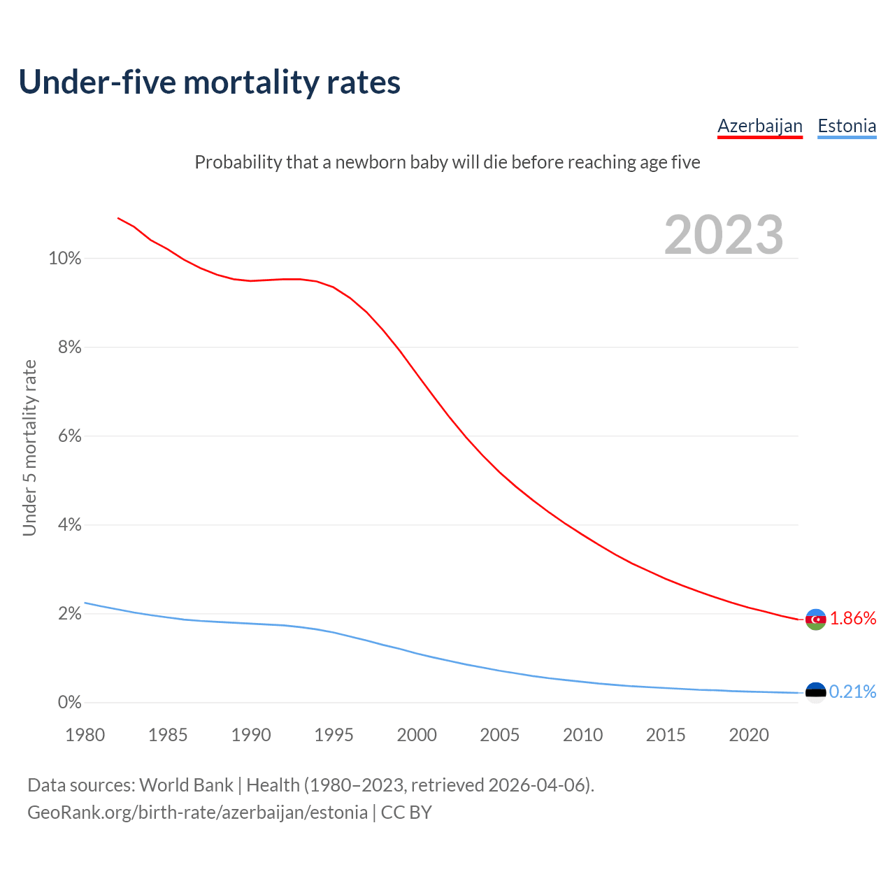The chance that a newborn baby will die before reaching age five is 1.86% in Azerbaijan and 0.21% in Estonia. Above is a chart with historical data on under-five mortality rates.